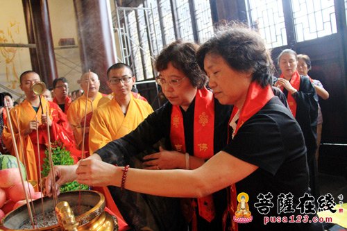 上午6时,上海宁国禅寺方丈平熙大和尚带领众功德主虔诚跪拜观世音菩萨,拈香礼佛,平熙大和尚手持杨枝净水,宣说观世音菩萨水文偈:“菩萨柳头甘露水,能令一滴遍十方,腥膻垢秽尽蠲除,令此坛场悉清净。”