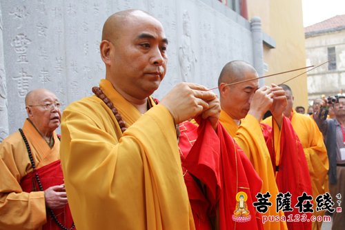 上午9时,恭奉老和尚灵骨迁入于新建舍利宝塔,依顺世间,入石塔中,永久供奉。法会由上海市佛教协会名誉会长、真如寺法主和尚妙灵长老;上海市佛教协会会长、上海佛学院院长、静安寺方丈慧明大和尚和上海市佛教协会副会长、法藏讲寺住持光慧大和尚共同主法。三位主法法师分别拈香,手持净水,绕塔洒净,并带领两序大众唱诵《大悲咒》、《心经》等等,功德回向无边众生,十方菩萨、八方善信数百人聚会一处,同沾法喜、共沐佛恩。